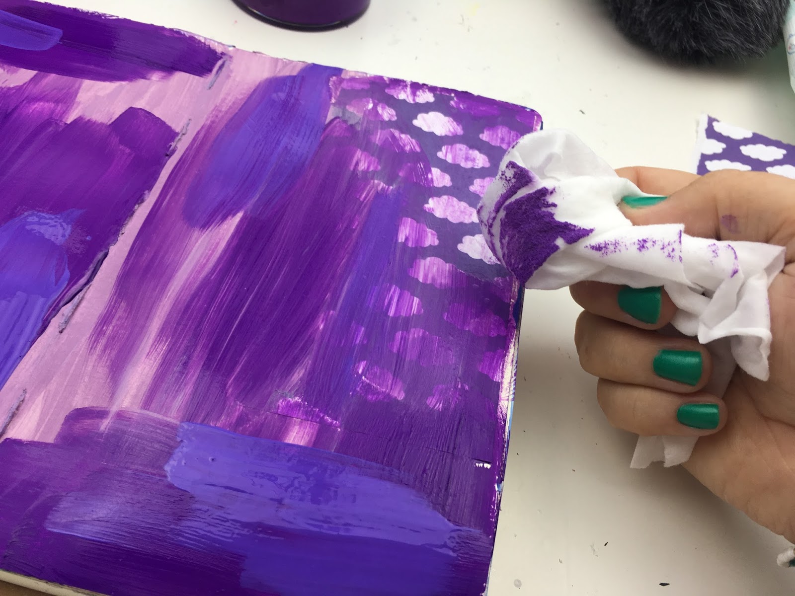 I enjoyed the process, it is very therapeutic randomly adding paint to a page and letting yourself go. I was a bit too enthusiastic though and covered up the paper more than I wanted to. To rectify this I used a baby wipe and gently removed some of the paint.